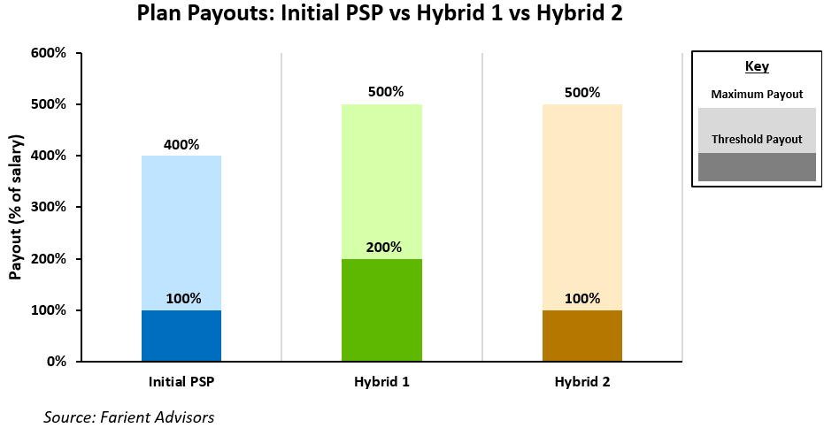 The illustrative example below demonstrates how Approach 2 would work in practice, where a 100% RSP award is made in addition to maintaining a 400% PSP. Hybrid 1 presents an example where no change is made to threshold vesting under the PSP, whilst Hybrid 2 assumes threshold vesting under the PSP is reduced to 0%.